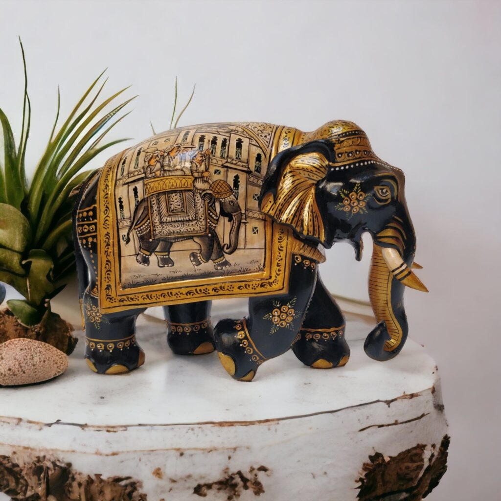 Hand-carved by skilled artisans, this wooden painted elephant showcases exceptional craftsmanship and attention to detail. The black and gold color theme, hand-painted to perfection, adds a regal and timeless allure that captures the eye and enhances the overall aesthetic of your decor.