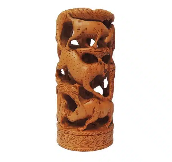 Explore the artistry of our round kadam wood animals carving, featuring deep jungle animal like lion monkey tiger deer motifs meticulously carved into the wood. Each piece stands 15 cm tall and 7 cm in diameter, showcasing intricate craftsmanship and attention to detail.